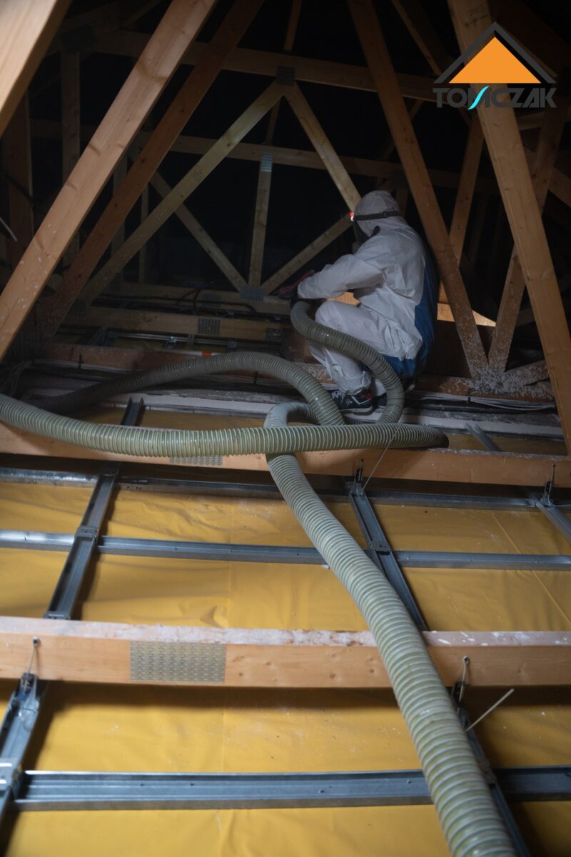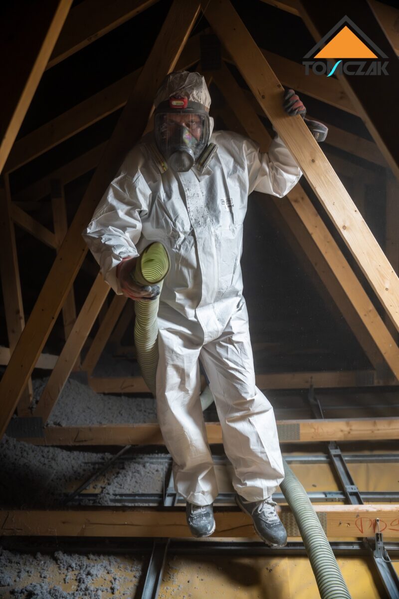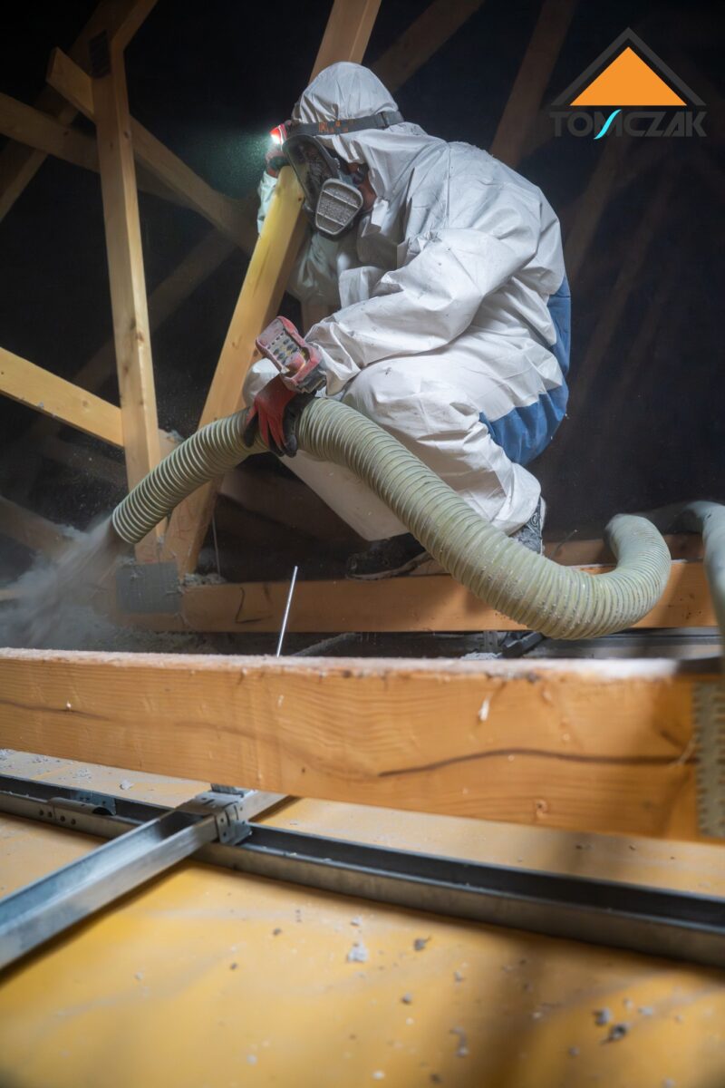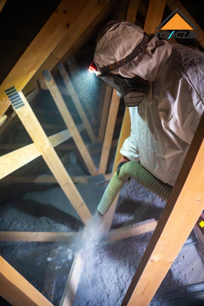 Dzięki technologii wdmuchiwania dokładnie wypełnia każdą przestrzeń, eliminując mostki termiczne i poprawiając komfort w domu przez cały rok.